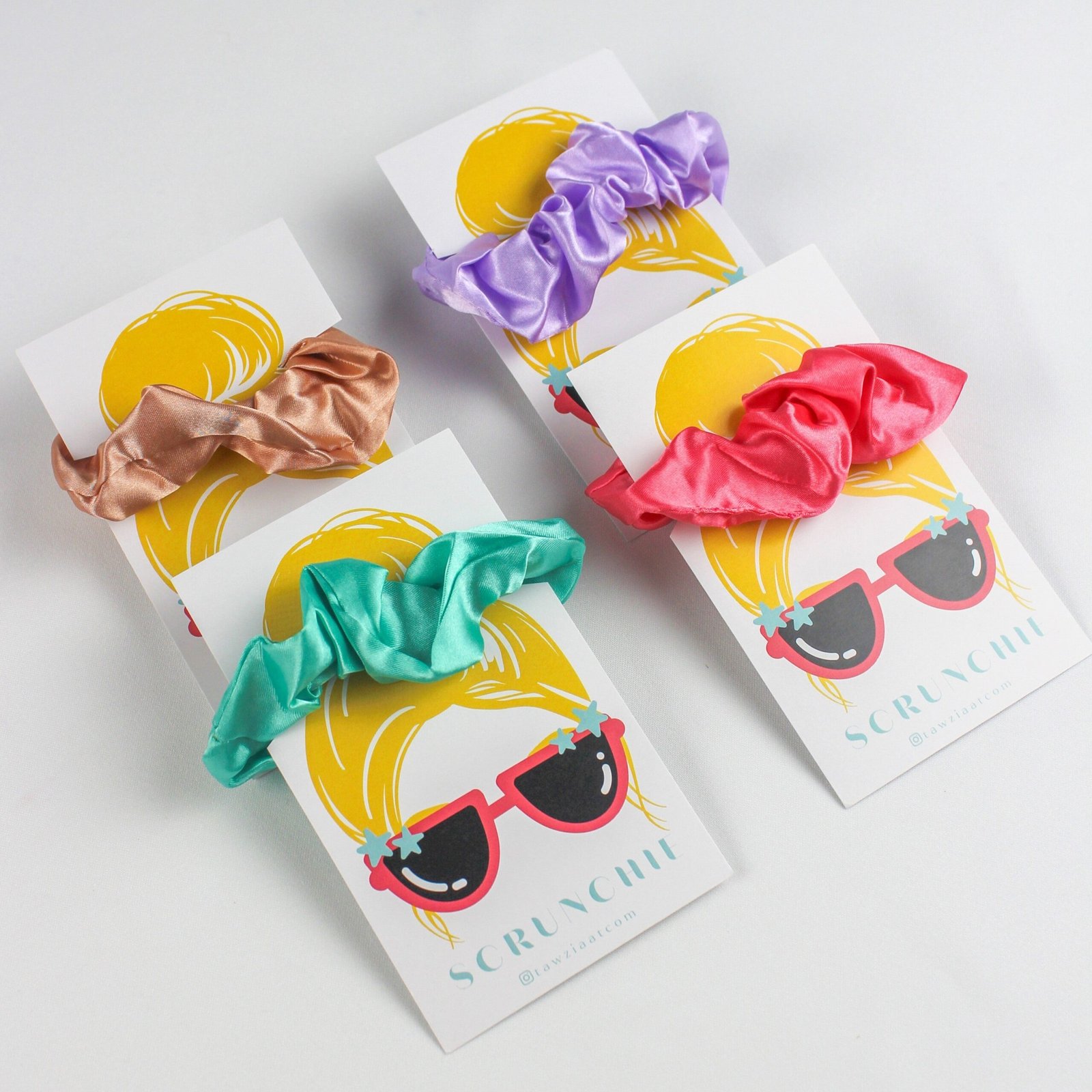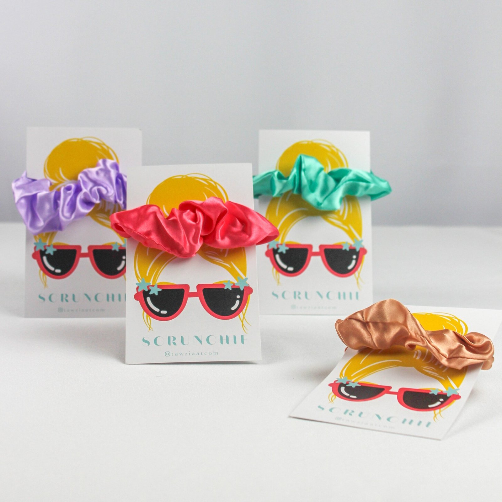 ربطات شعر من الستان بألوان منعشة في تغليف ورقي بتصميم جميل لربطات الشعر لجمعاتكم المميزة وجميع مناسباتكم