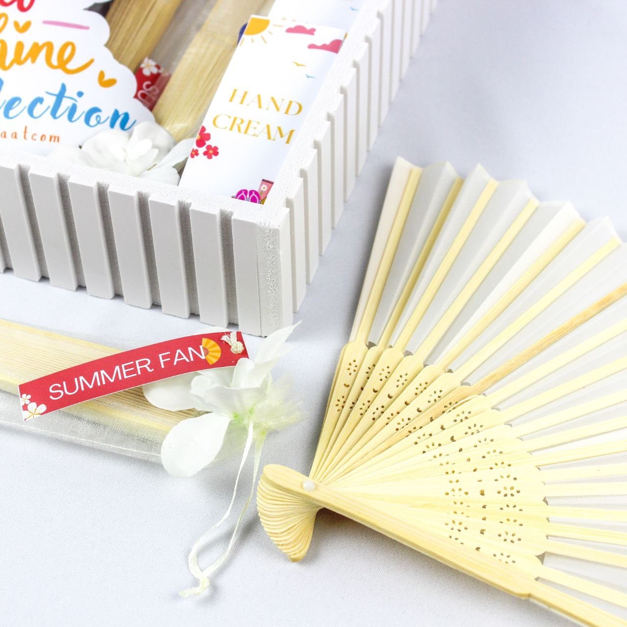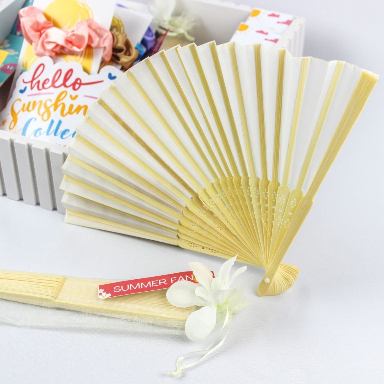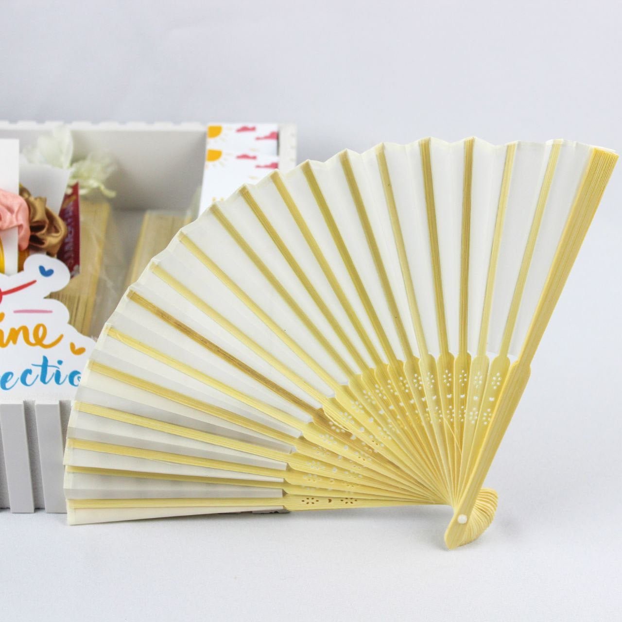 مروحة أنيقة من الخشب المنقوش المغلفة بكيس من الاورقانزا الرائع ، تأتي هذه الهدية لتدمج بين الاناقة والجمال