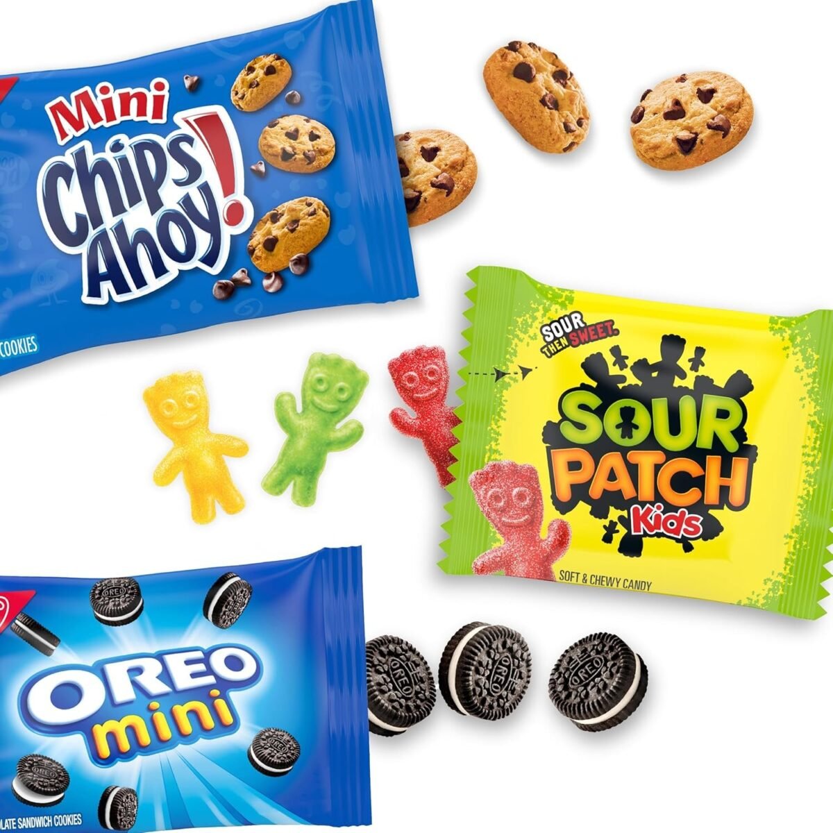 Nabisco Cookies & Candy Variety Pack. SOUR PATCH KIDS Candy. OREO Mini Cookies. and Mini CHIPS AHOY! Cookies. 30 Snack Packs